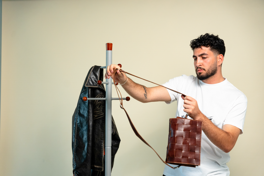 Durch das Lederhandwerk seiner Familie verbindet er Materialwissen mit einem experimentellen Ansatz: ausprobieren, lernen, entwickeln.